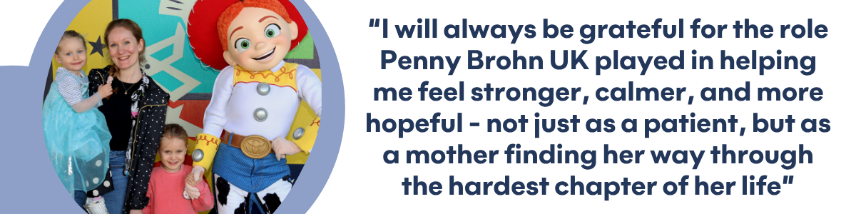 Knowing that Penny Brohn UK are there should I or anyone I know need it is amazing. It’s the nurturing and support that you feel through your body and mind, which is missed in the clinical setting. It’s that extra layer, you can’t just fix someone with medicine and surgery, you need to look at the whole-person. If I didn’t access Penny Brohn UK I think I’d still be carrying a lot more trauma and be very broken. I will always be grateful for the role Penny Brohn UK played in helping me feel stronger, calmer, and more hopeful – not just as a patient, but as a mother finding her way through the hardest chapter of her life.